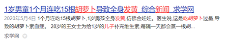 就像上面这则新闻一样,28岁的王女士为了给1岁的儿子补充维生素,每隔一天会蒸一根胡萝卜给他吃,1个月后,儿子皮肤发黄,脸上、脚掌尤为明显。吓得赶紧把娃送去医院。