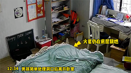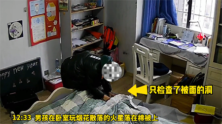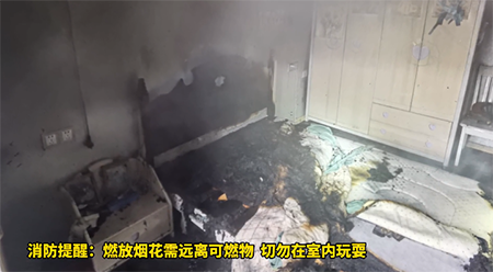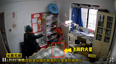 再举个例子,2022年2月3日,安徽芜湖市的一个小男孩,拿着点燃的仙女棒,在自己的卧室转悠了一圈,然后就有一个火星落到了被子上。