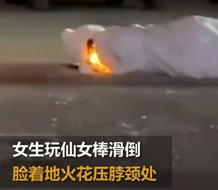 哪怕是大人,玩仙女棒的时候也要注意,燃烧中溅落的火星,烧衣服一烧一个洞!要是像下面这样,转圈时不小心滑倒了,仙女棒还有可能会烧到皮肤和头发!