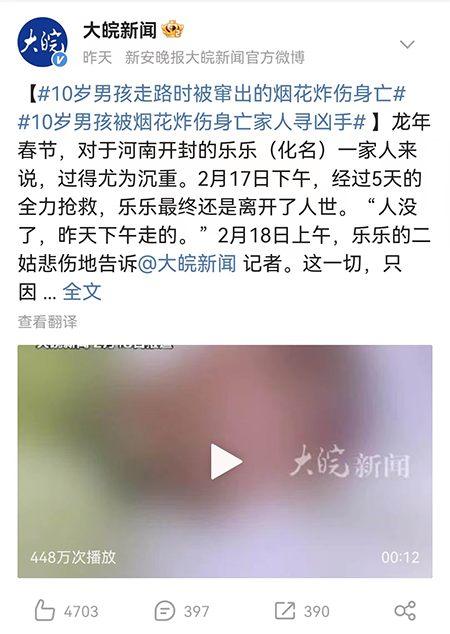 就在前几天,河南开封的一名10岁孩子被路边突然窜出的烟花炸伤。虽然经过了5天的全力抢救,但还是于前日不幸身亡。