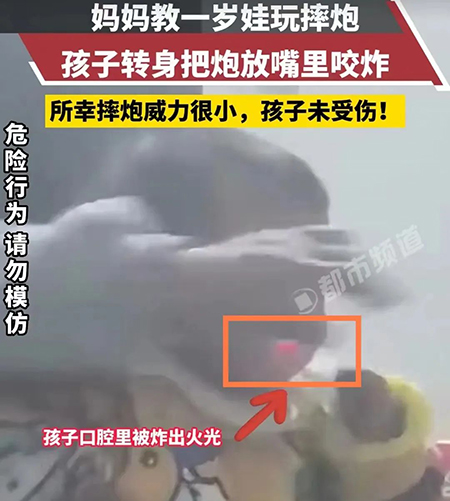 在河南周口,家长正在教1岁半的小女孩玩摔炮,转个头的功夫,孩子就把摔炮塞到了嘴里,直接就咬炸了!