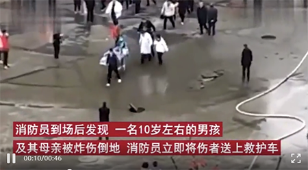 小男孩和他的妈妈当场被炸伤,倒地不起。