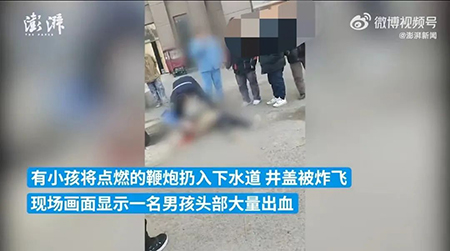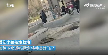 还有前年1月24号,四川省巴中市一个10岁的男孩往下水道扔鞭炮,下水道里面的沼气发生了爆燃,这次直接炸飞了5个井盖!